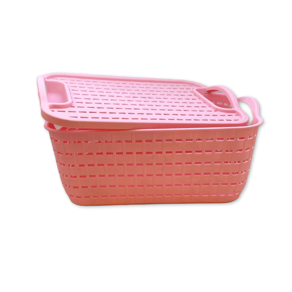 方格纹藤编篮带盖 中
